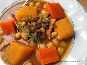Pasado este tiempo añadimos el zumo de naranja y el caldo de pollo, dejamos cocer durante 15 - 20 minutos o hasta que el boniato esté tierno, retiramos del fuego y trituramos en la batidora hasta conseguir una crema fina.