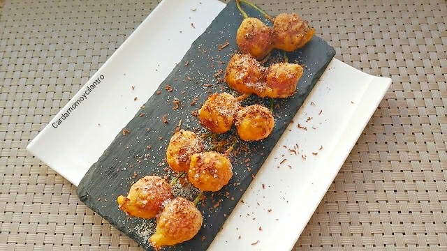 Las cerezas van rebozadas en una pasta para después freírlas en aceite de oliva, se espolvorean con azúcar y chocolate rallado, se toman calientes y es un postre con fruta sencillo y exquisito